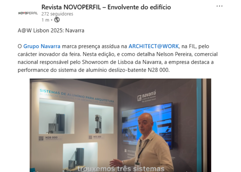 Tuesday, 27 January 2026Na entrevista ao Novo Perfil, o Grupo Navarra partilha a sua abordagem ao desenvolvimento de sistemas em alumínio, assente na proximidade ao mercado, na escuta ativa dos arquitetos e na constante evolução tecnológica dos seus produtos. Uma visão que reforça o papel da Navarra como marca industrial que transforma complexidade técnica em valor para o projeto arquitetónico.